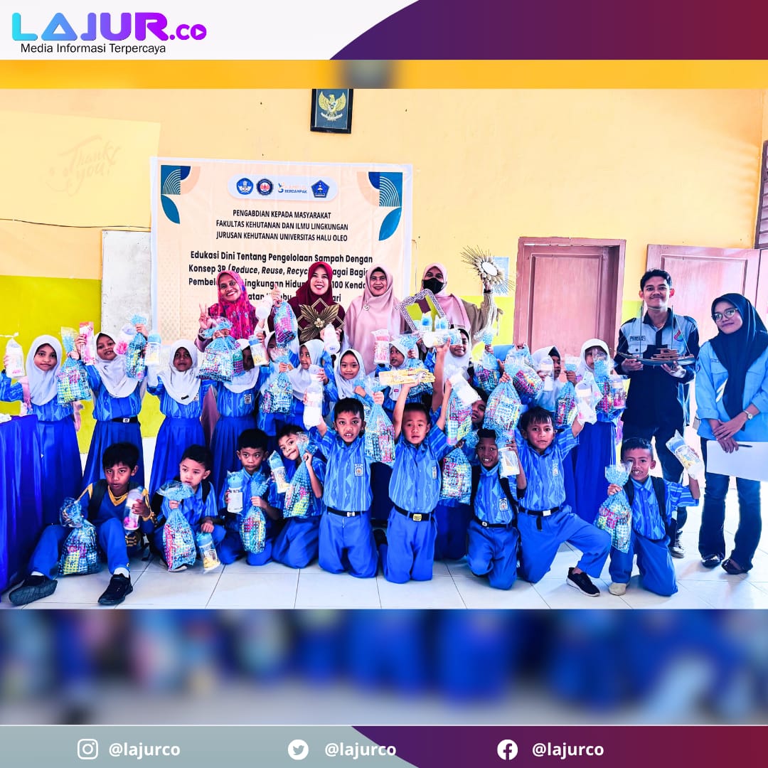 LAJUR.CO, KENDARI — Fakultas Kehutanan dan Ilmu Lingkungan Universitas Halu Oleo (UHO) melalui Jurusan Ilmu Lingkungan, memberikan edukasi dini tentang teknik pengelolaan sampah berbasis konsep 3R (Reduce, Reuse, Recycle) kepada siswa-siswi SDN 100 Kendari, Kecamatan Kambu.