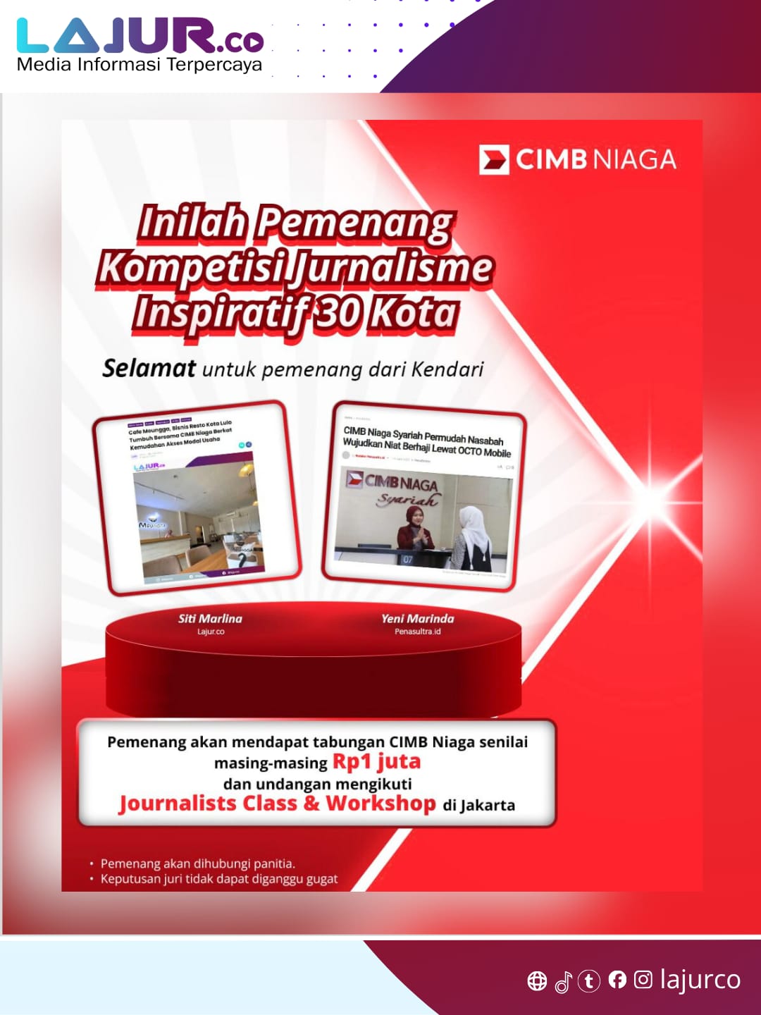 LAJUR.CO, KENDARI – Dua jurnalis asal Sulawesi Tenggara (Sultra) lolos sebagai pemenang ajang Road to CIMB Niaga Jurnalisme Inspiratif 2025. Kedua pemenang yakni Siti Marlina dari media Lajur.co dan Yeni Marinda dari Penasultra.id menjadi dua perwakilan jurnalis asal Kota Kendari yang menjuarai kompetisi Jurnalisme Inspiratif 30 Kota di Indonesia.
