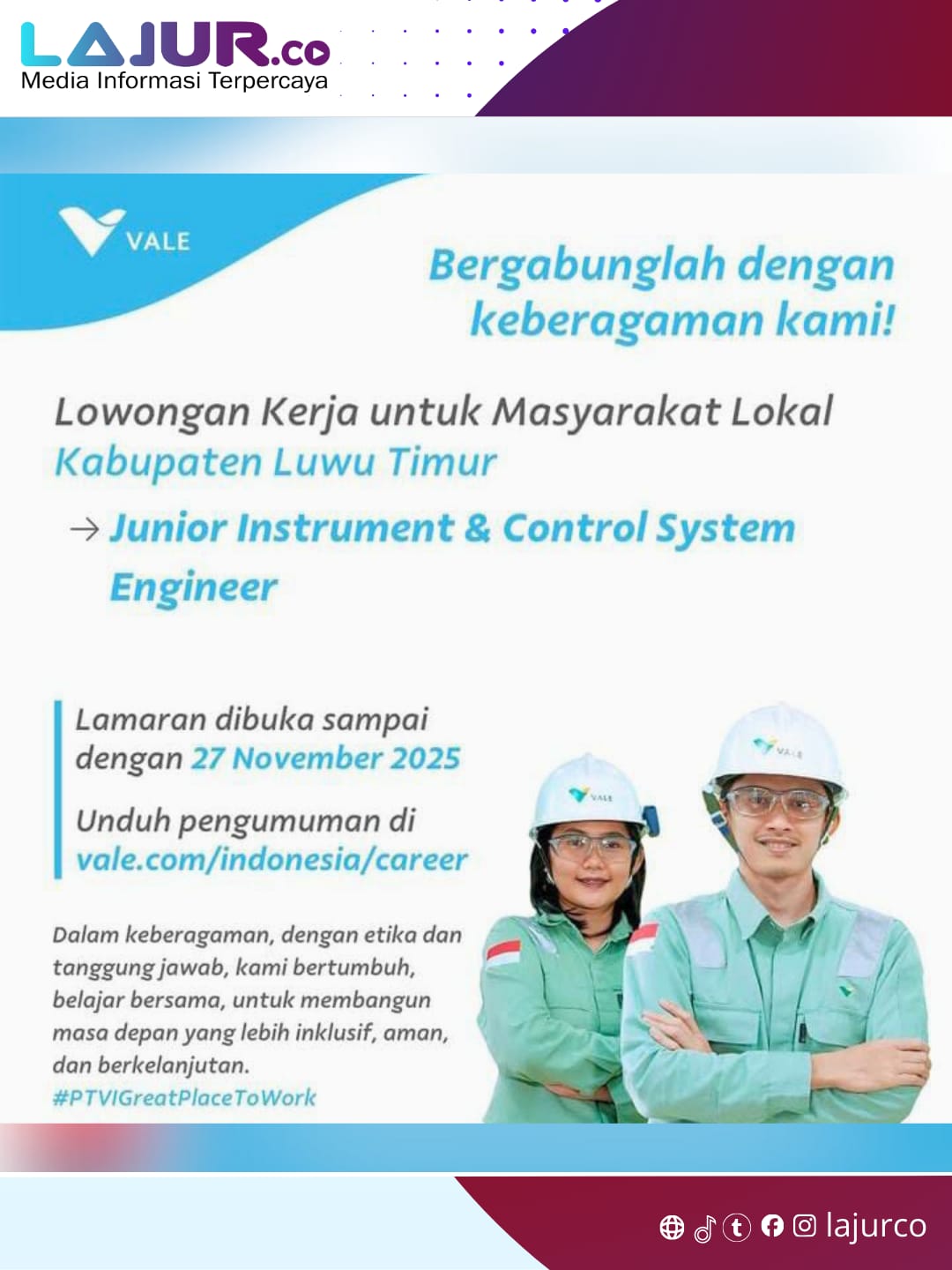 LAJUR.CO, KENDARI – Kabar baik bagi masyarakat Kabupaten Luwu Timur. PT Vale Indonesia Tbk kembali membuka kesempatan kerja khusus bagi warga lokal untuk posisi Junior Instrument & Control System Engineer.