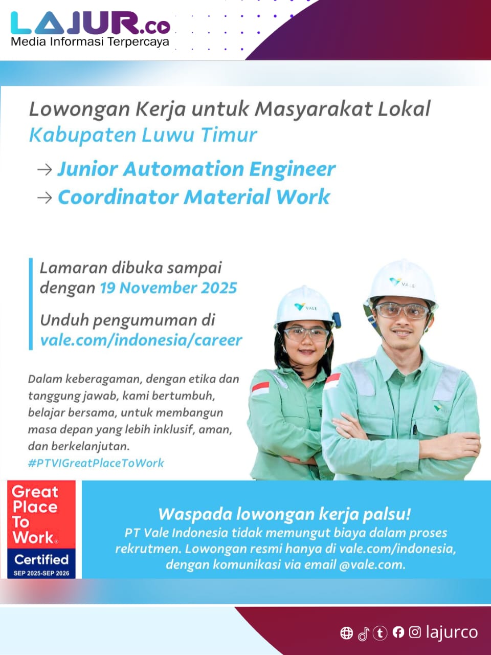 PT Vale menegaskan komitmennya untuk terus memberdayakan masyarakat lokal serta menyediakan akses kesempatan kerja yang lebih luas. Warga Luwu Timur yang berminat pada kesempatan karier itu dapat melakukan pendaftaran melalui laman https://s.id/NJYWr hingga tanggal 19 November 2025. Adv