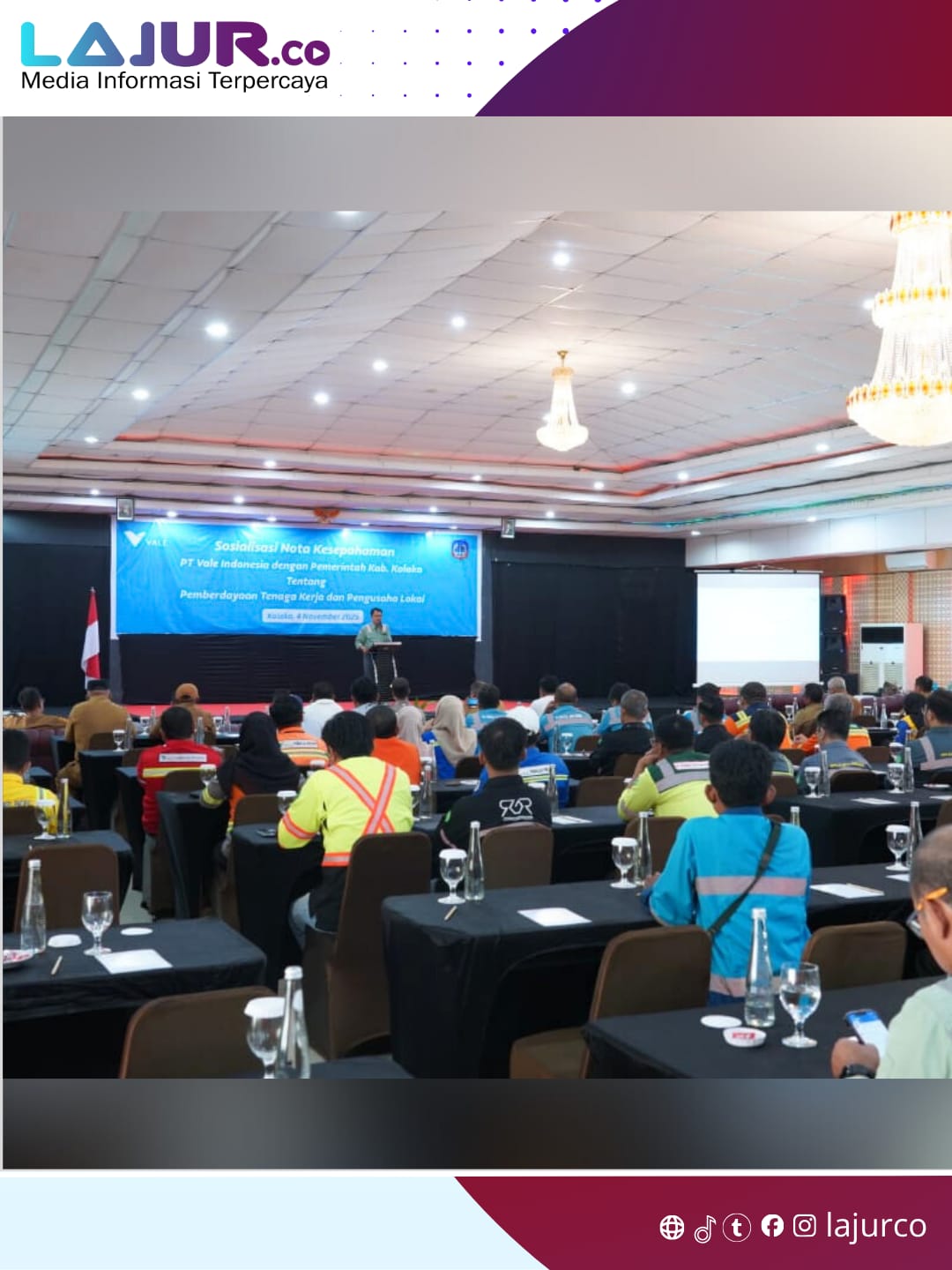 LAJUR.CO, KENDARI — Sebagai bagian dari komitmen untuk mendorong pertumbuhan ekonomi nasional yang inklusif dan berkelanjutan, PT Vale Indonesia Tbk (PT Vale), bagian dari MIND ID Holding BUMN Pertambangan, bersama Pemerintah Kabupaten (Pemkab) Kolaka melaksanakan Sosialisasi Nota Kesepahaman (MoU) tentang Pemberdayaan Tenaga Kerja dan Pengusaha Lokal di Gedung Sultan Raja, Kolaka.