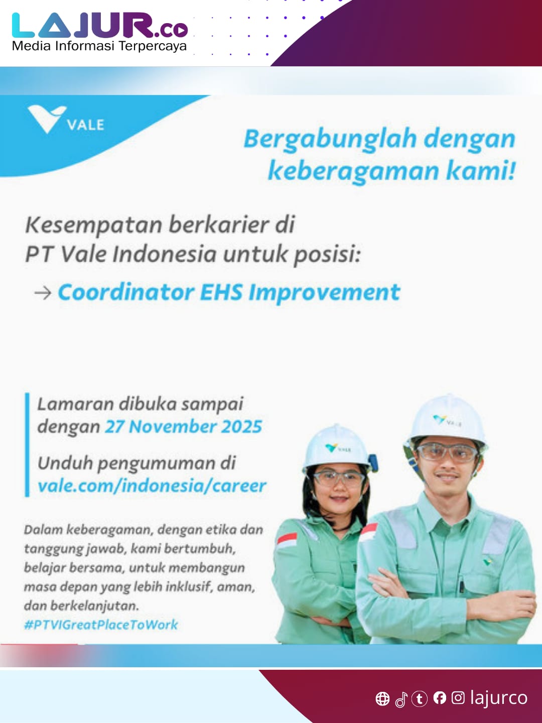 LAJUR.CO, KENDARI – PT Vale Indonesia Tbk kembali membuka kesempatan karier bagi putra-putri terbaik bangsa melalui rekrutmen nasional untuk posisi “Coordinator EHS Improvement”.