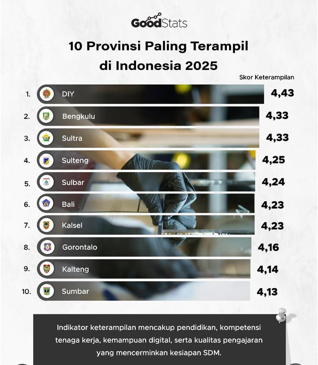 Data ini dilansir dari laman GoodStat berdasarkan laporan resmi dari Badan Riset dan Inovasi Nasional (BRIN). Dengan skor keterampilan 4,33, Sultra sejajar dengan Bengkulu dan hanya kalah tipis dari DI Yogyakarta yang memimpin dengan skor 4,43.